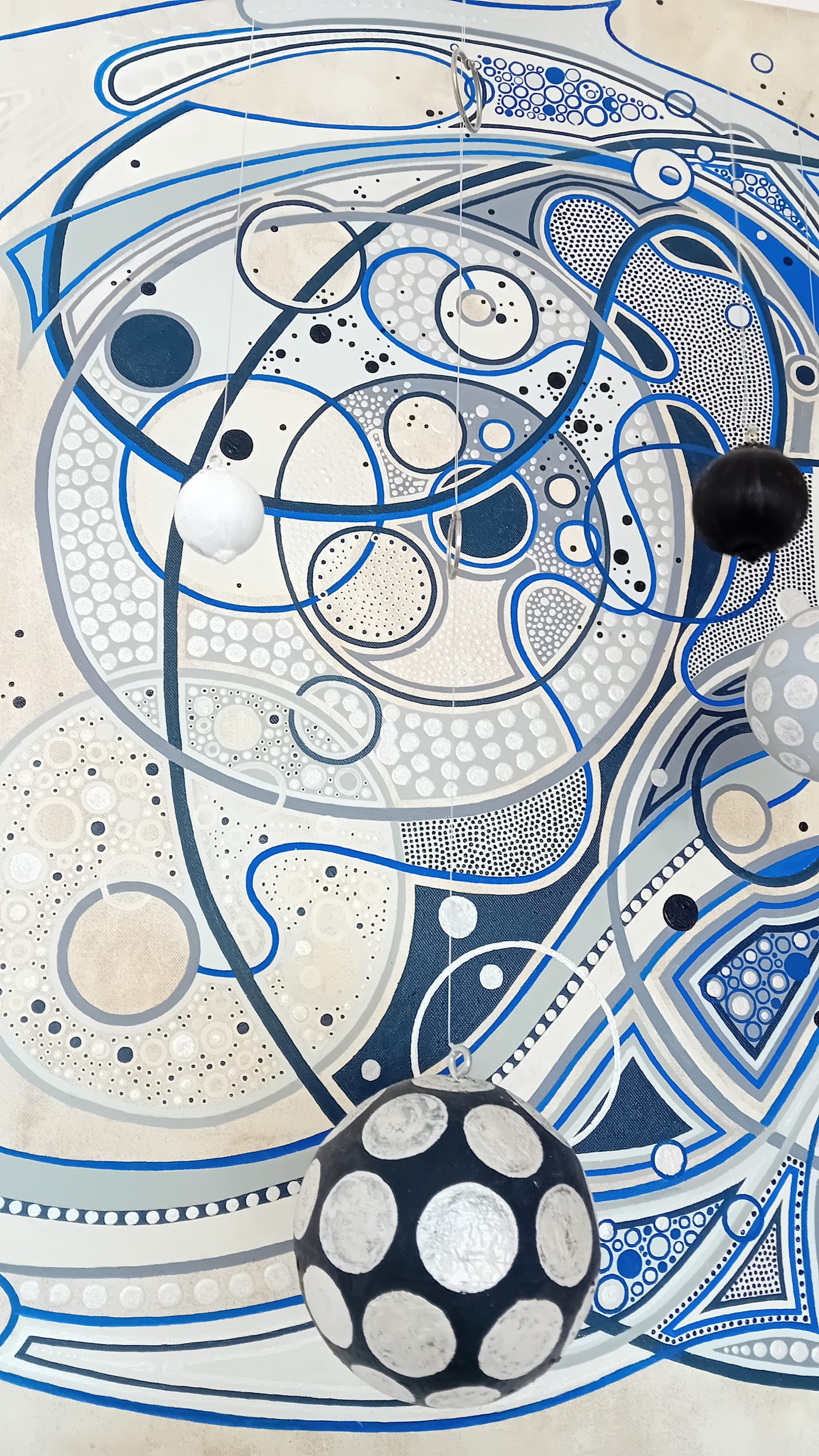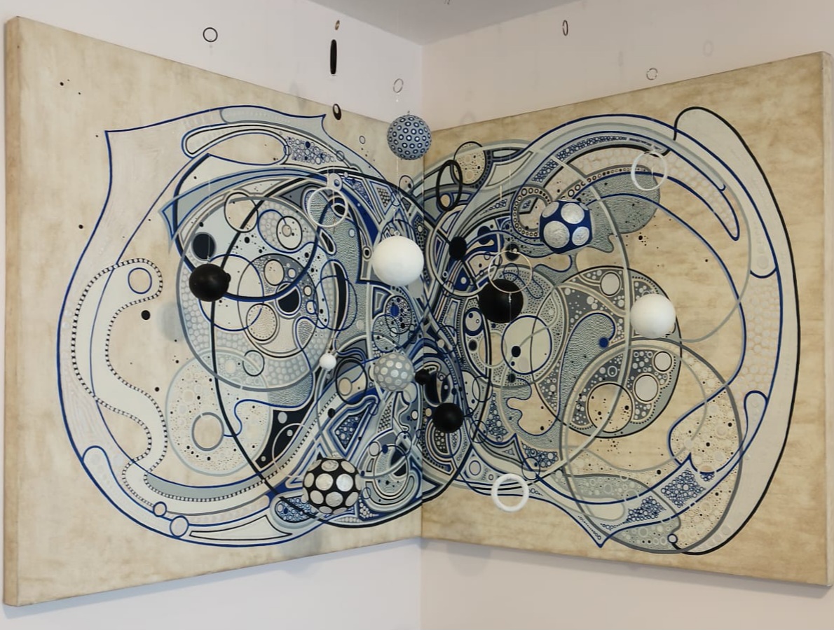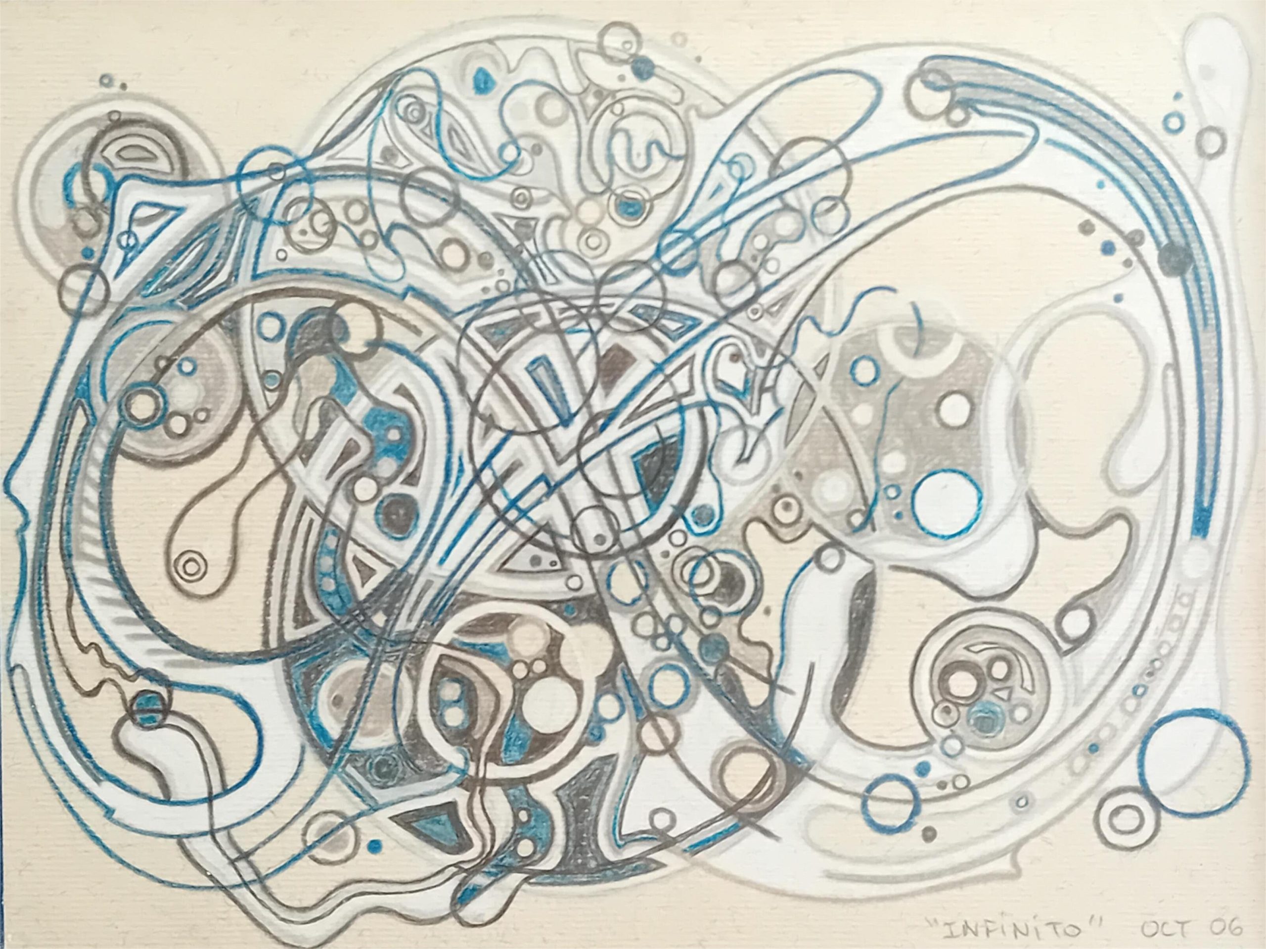 Esta obra pictórica, titulada "Infinito", evoca la profundidad y el misterio de lo eterno. Las complejas formas geométricas y las esferas suspendidas crean una sensación de movimiento y expansión constante, como si estuvieran en un flujo infinito de energía. Los tonos de azul y los patrones entrelazados transmiten calma, conexión y un sentido de continuidad que invita a perderse en sus detalles.