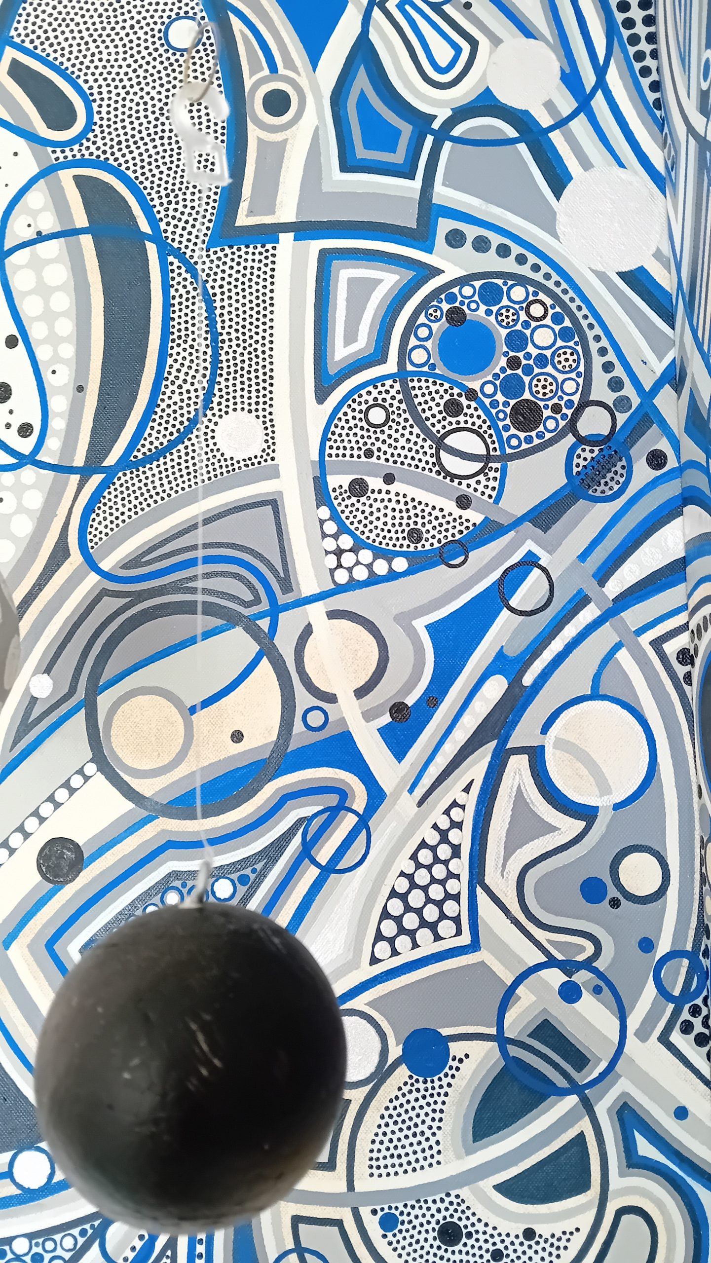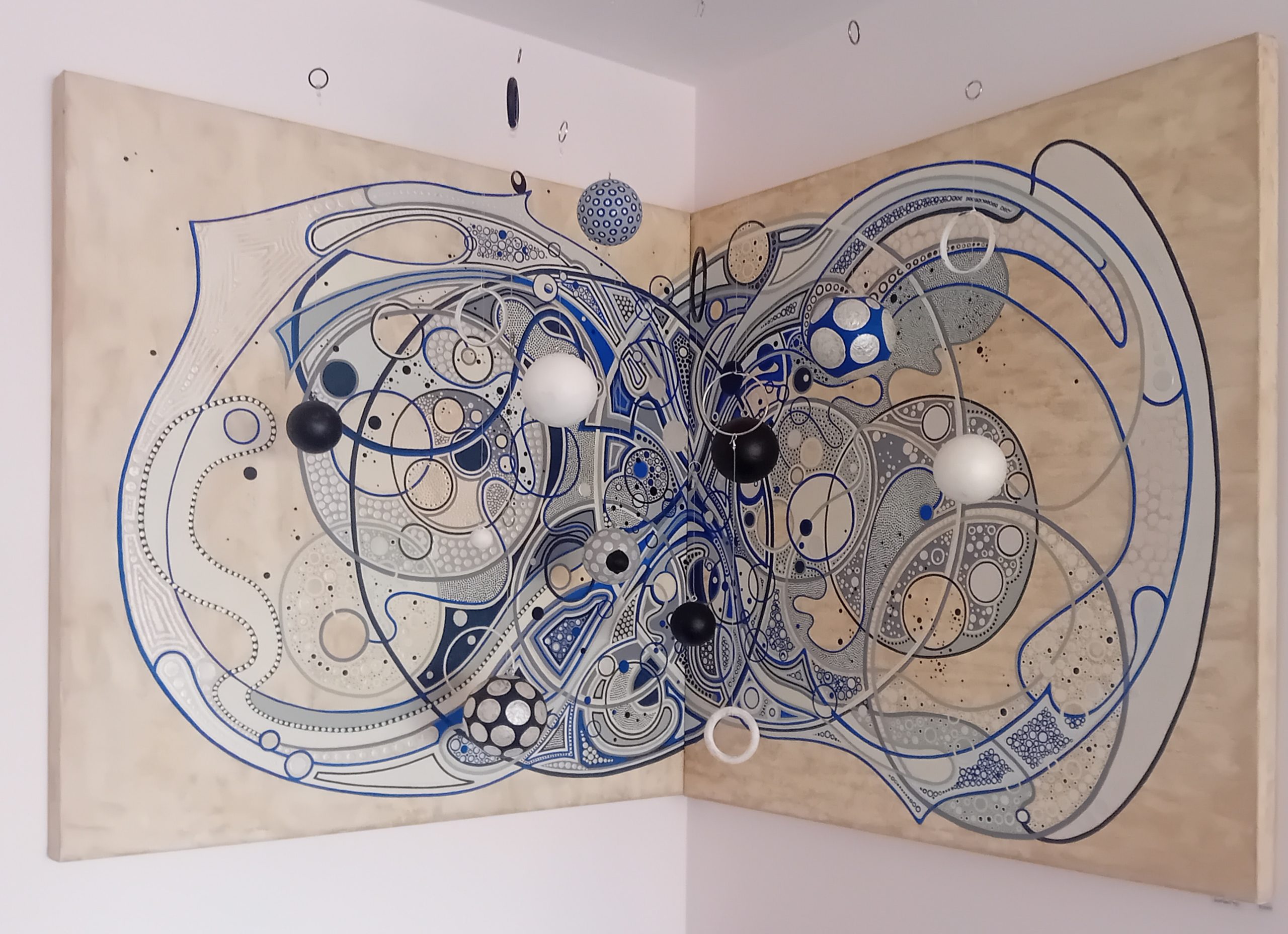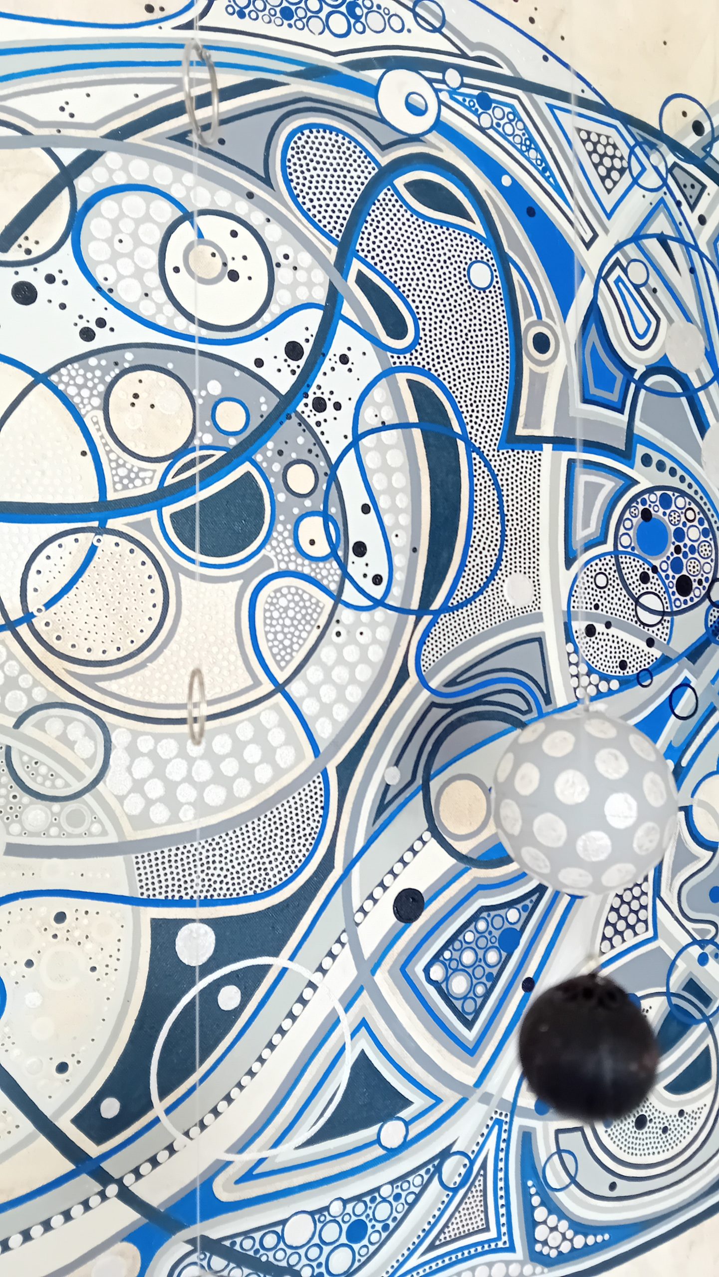 Esta obra pictórica, titulada "Infinito", evoca la profundidad y el misterio de lo eterno. Las complejas formas geométricas y las esferas suspendidas crean una sensación de movimiento y expansión constante, como si estuvieran en un flujo infinito de energía. Los tonos de azul y los patrones entrelazados transmiten calma, conexión y un sentido de continuidad que invita a perderse en sus detalles.